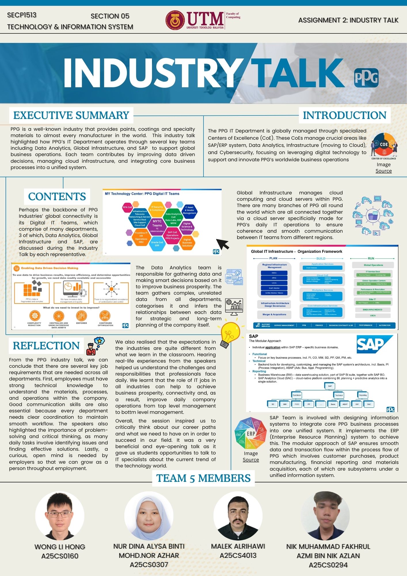 The PPG industry talk helped me understand the important role of IT in supporting business operations through teams such as data analytics, infrastructure, and ERP systems. It showed how structured systems improve efficiency and coordination in large organizations. The session could be enhanced with more real system demonstrations and practical examples. Overall, the talk helped bridge the gap between classroom learning and real-world applications and encouraged me to further develop my IT knowledge.