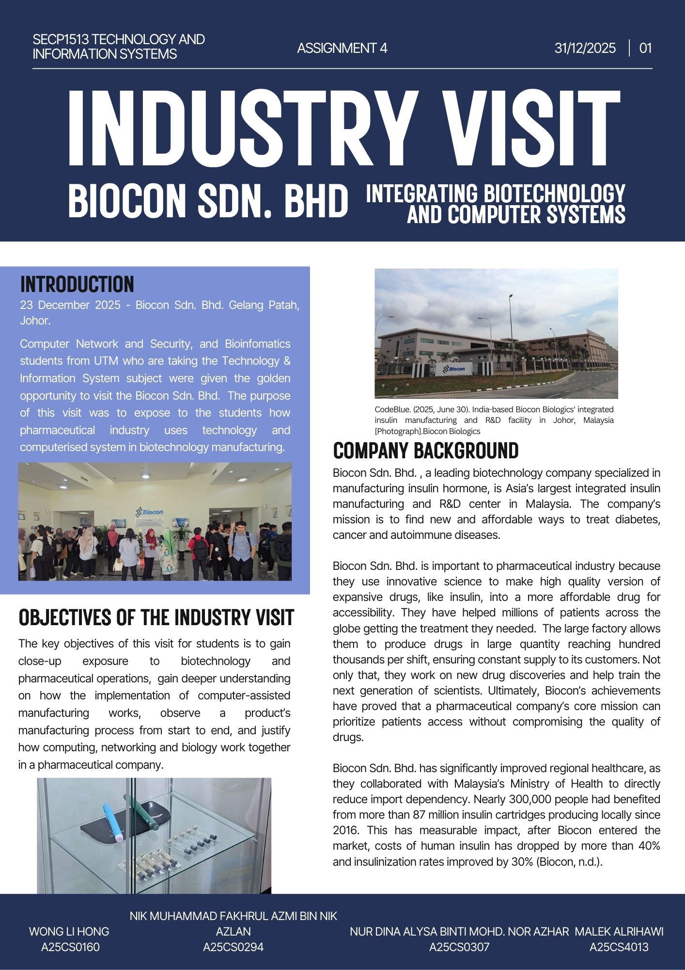 The industry visit to Biocon Sdn Bhd exposed me to a highly disciplined and structured working environment in a large-scale industry. I learned about the drug production process, including formulation, filling, inspection, and packaging, which showed the importance of accuracy and strict procedures. Although the visit was limited by privacy restrictions, the sharing session provided strong motivation and real work insights. Overall, the visit increased my respect for professional discipline and inspired me to adapt to real workplace standards.